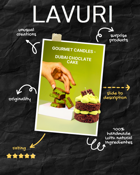 LAVURI® DUBAI Schokoladenkuchenkerze, 100 % handgefertigte Duftkerze aus Sojawachs, Pistaziencreme-Optik auf flauschigem Kuchenboden