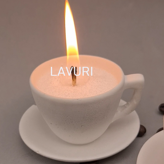 LAVURI® ESPRESSO Tasse auf festem Teller für Wachskerzen, Kerzensand / Perlwachs, Stabkerzen- Halter, Dekoration und als Duftkerzen Varianten erhältlich