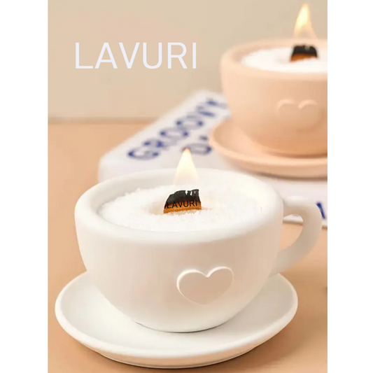 LAVURI® Cappuccino Tasse mit separatem Teller für Wachskerzen, Kerzensand / Perlwachs, Trockenblumen, Dekoration und als Duftkerzen Varianten erhältlich