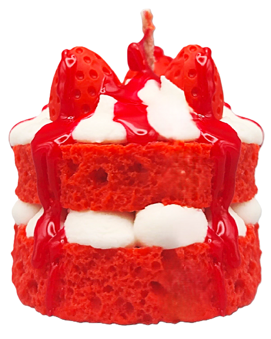 LAVURI® RED Velvet Erdbeerkuchen mit Schlagsahne und Früchten als Topping auf einem roten, fluffigen Kuchenboden – eine Gourmet-Dessertkerze aus 100 % Sojawachs.