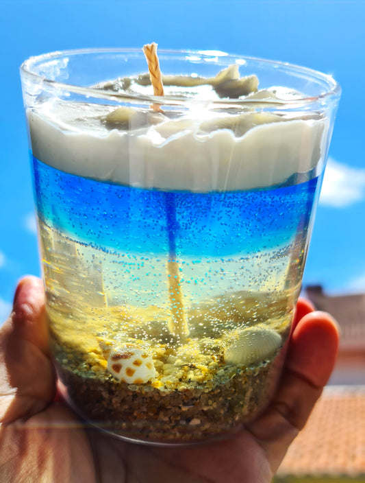 LAVURI® PRAIA Strandkerze mit handverlesenem Sand und Muscheln aus Portugal in glitzerndem Gelwachs und 100 % natürlichem Sojawachs als Topping.