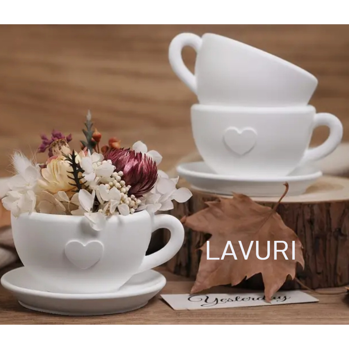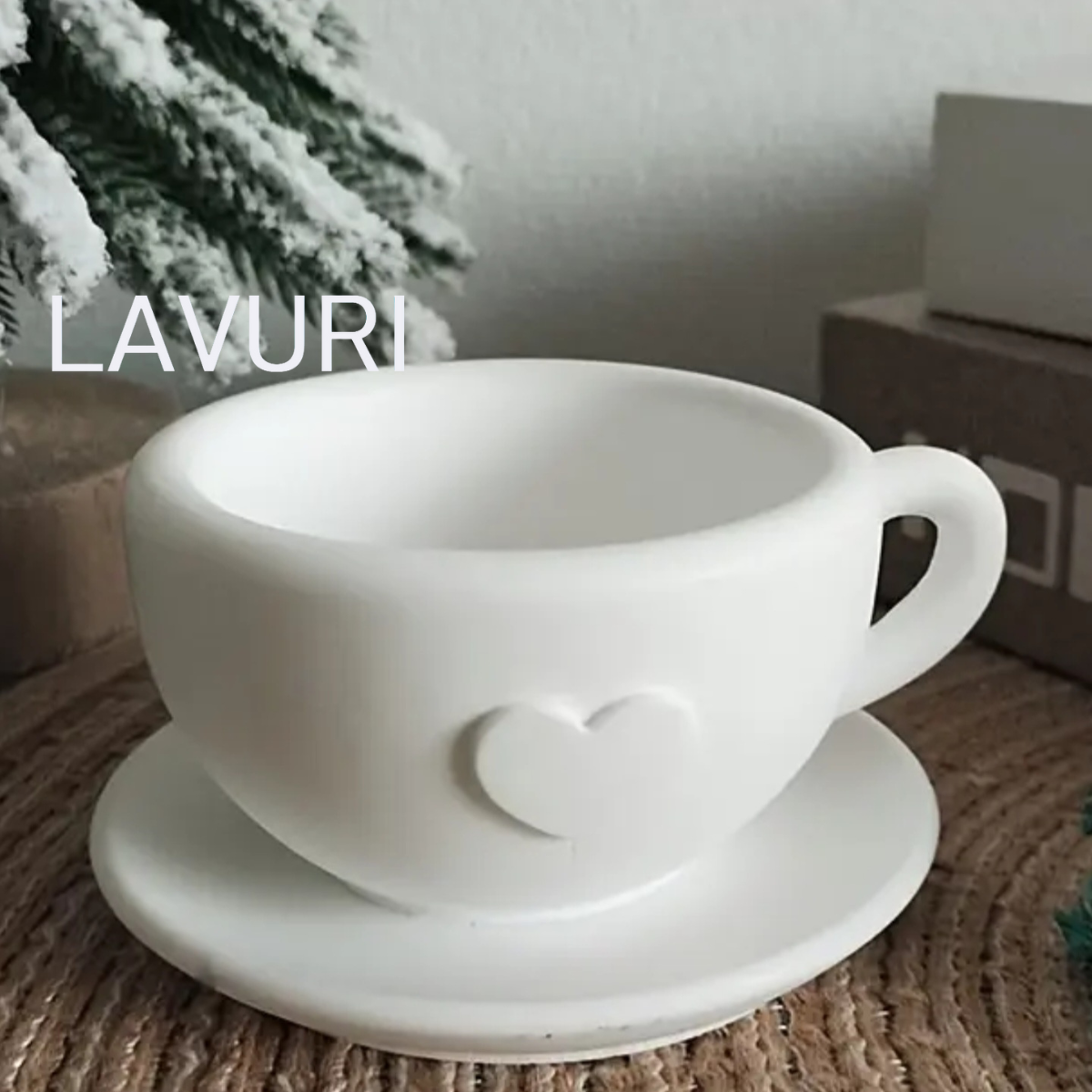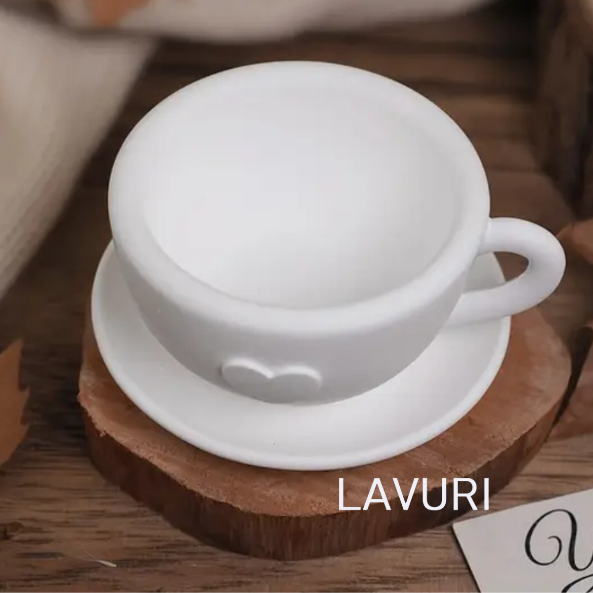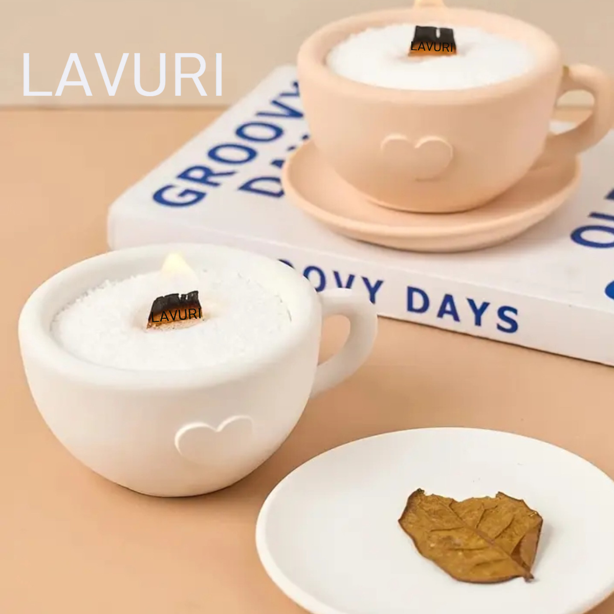 LAVURI® Cappuccino Tasse mit separatem Teller für Wachskerzen, Kerzensand / Perlwachs, Trockenblumen, Dekoration und als Duftkerzen Varianten erhältlich